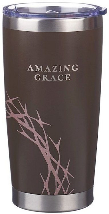 The Amazing Grace Brown Stainless Steel Travel Tumbler is part of the broader Amazing Grace Brown Crown Of Thorns Collection, which includes a magnet, a Deluxe KJV Gift Bible, a genuine leather wallet, a faux leather bookmark, a metal keychain, a die-cut magnetic set, a stainless steel travel tumbler, a classic faux leather journal, a cardstock bookmark with tassel, a faux leather Bible cover, a giant print KJV Bible, a daily devotional, a stainless steel water bottle, a gift bag, and a spiral notebook.