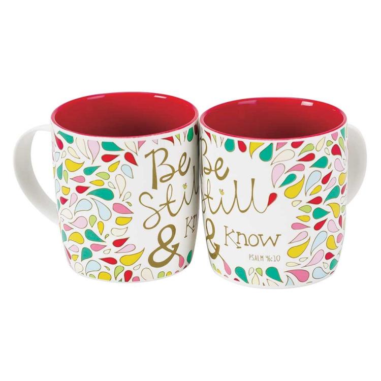 Be Still & Know Ps. 46:10 – New Bone China -12 1/2 oz. – 2 per brown box with black & white label – Dishwasher & Microwave Safe -Red Inner Color By Lindsay Hopkins