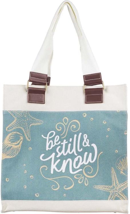 The Be Still Canvas Tote Bag Tote is made from high quality heavyweight cotton canvas in a light natural tone with reinforced handles and gusseted sides. The full-color coastal design will put you in beach mode with its sandy colored shell-and-sea-star design on a blue-green background.