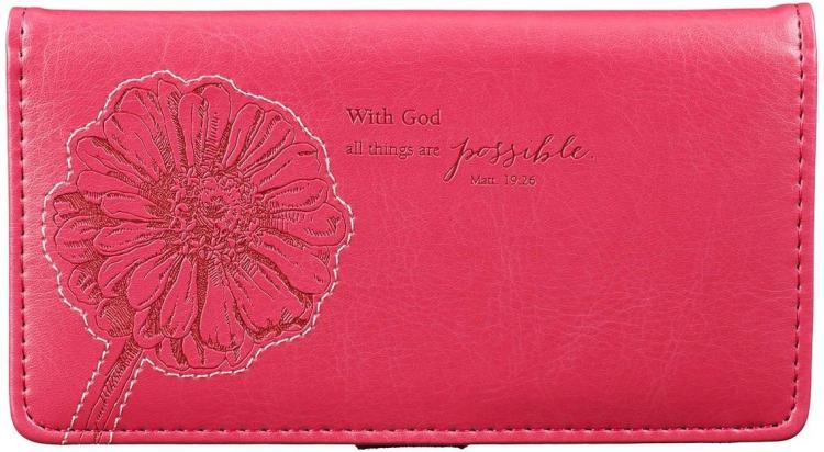 Anyone will treasure this Inspirational Checkbook Cover constructed of quality man-made material imported from Italy~ with the look and feel of real leather (trade name LuxLeather). Adorned with a contrast top-stitched zinnia and Scripture from Matthew 19:26 debossed into the cover~ the checkbook wallet offers the functionality of a billfold. With an inside slip pocket~ 3 credit card slots~ an ID card window~ plastic divider for duplicate checks and a pen loop~ this accessory holds all that you need for banking~ paying and record keeping.
