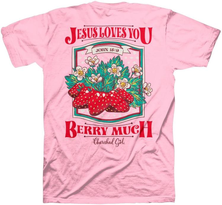 “Berry Much Embrace the sweet life in this charming Berry Much Cherished Girl T-Shirt in Classic Pink. Good things grow and thrive in our lives when we choose to follow Jesus, and that Good News is worth celebrating.