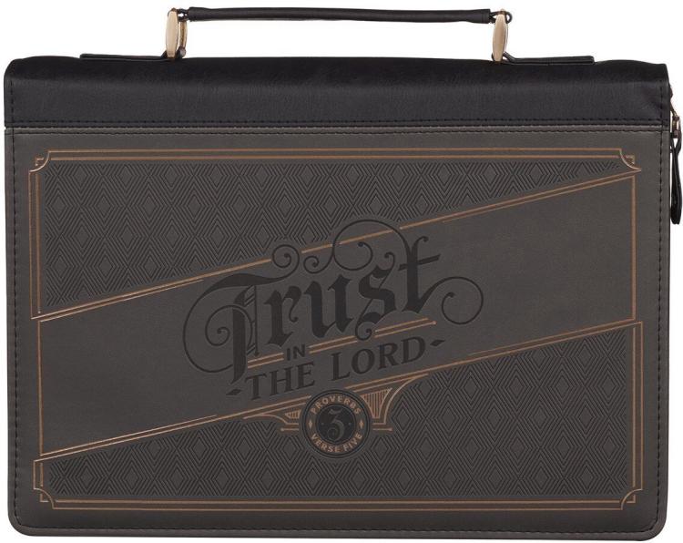 The Trust in the LORD Charcoal Faux Leather Bible Cover is part of the Trust in the Lord Charcoal and Brown Collection that includes a ceramic coffee mug, a metal key chain, a faux leather Bible cover, a spiral journal, a gift bag, a faux leather journal, and a reusable non-woven shopping bag.