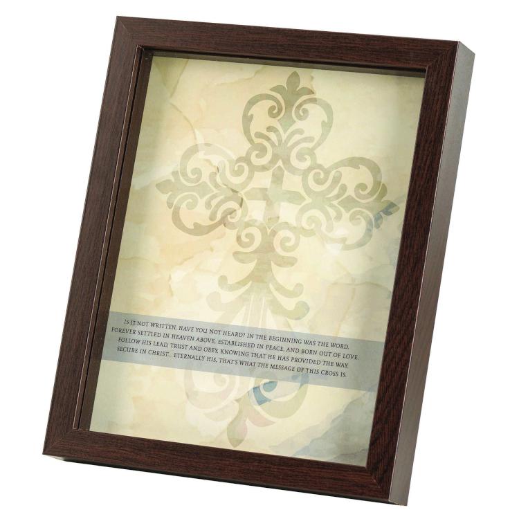 The beautiful poem Eternal Cross is on the underside of glass that’s set 3/4″” above the print in a shadow box style frame, offering a rich dimensional effect. Soft ornate cross design is a neutral tone that works well with almost any d cor. Frame is wood with walnut tone finish. On back side is a pull-out easel plus metal wall hanger to allow tabletop or wall display. Glass and print are 8″” x 10″”; outer frame size is 9″” x 11″” x 1 1/4″”. Assembled in the US of imported materials.