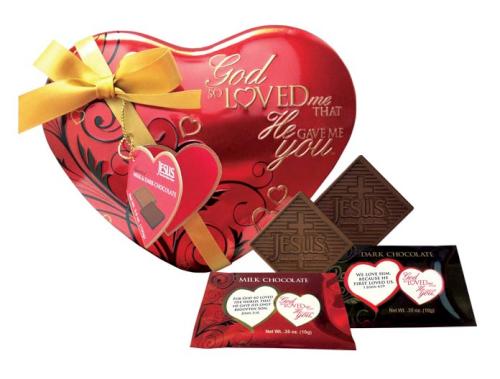 This beautifully embossed heart-shaped tin is filled with 3.5 oz. of assorted milk and dark chocolates. Each piece is individually wrapped in the God So Loved Me That He Gave Me You theme and a love scripture. Tin is embellished with an elegant bow and hangtag. Makes a great Valentine s Day gift.