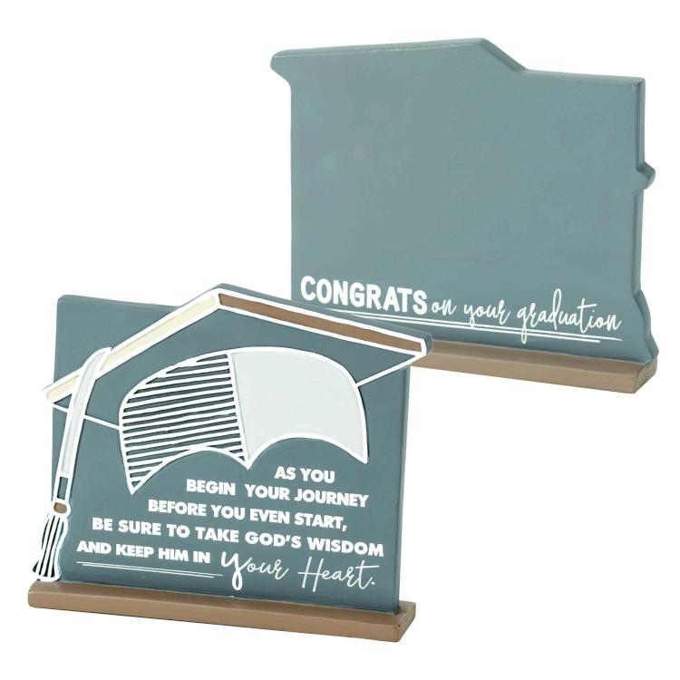 Congrats on Your Graduation Tabletop Plaque Figurine – Small tabletop plaque beautifully expresses your congratulations. Front side has tasseled cap design and is engraved with a short verse “”As you begin your journey before you even start be sure to take God’s wisdom and keep Him in your heart.”” Back side is engraved with “”Congrats on your graduation.”” Made of resin this plaque is 3 7/8″” tall x 4 1/2″” wide x 1″” deep base and 3/8″” thick plaque. Poem by Alda Maria copyright Dicksons.