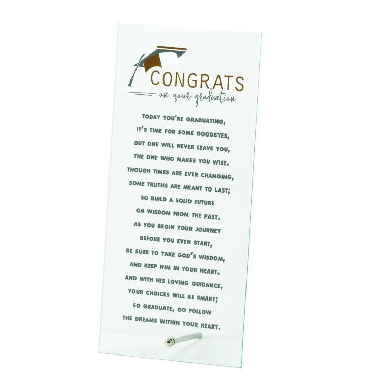 Congrats on Your Graduation Tabletop Glass Plaque This clear glass tabletop plaque is an inspiring graduation gift with its meaningful poem. Glass is 4 5/8″” x 10 1/8″”. Includes silver metal peg stand. Text of poem: Today you’re graduating it’s time for some goodbyes but one will never leave you the one who makes you wise. Though times are ever changing some truths are meant to last; so build a solid future on wisdom from the past. As you begin your journey before you even start be sure to take God’s wisdom and keep Him in your heart. And with His loving guidance your choices will be smart; so graduate go follow the dreams within your heart. Verse by Alda Maria copyright Dicksons