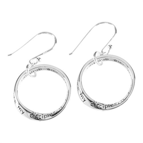 Stylish earrings feature a mobius (or twist) ring hoop that is engraved with a beloved Bible verse across all surfaces, front and back. Hoops are silver plated; wires are sterling silver. Each pair comes on a display card with verse reference and a portion of the verse.