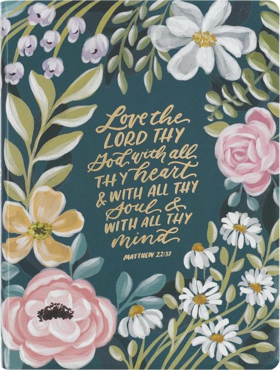 An exquisite gold foiled floral pattern, framed with a gold foiled border, is outlined on the front, back, and spine of this hardcover note-taking Bible. The gold foiled title is placed within a small navy frame outline in gold foil on the front cover and the spine.