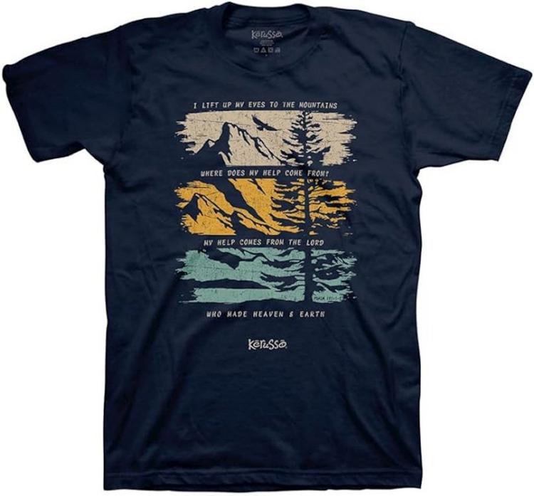 Lift your eyes to the mountains in this memorable Lift My Eyes Up T-shirt by Kerusso in Navy. Our help comes from the Lord, the very maker of the stars above. We can trust Him to make a way through our personal challenges.