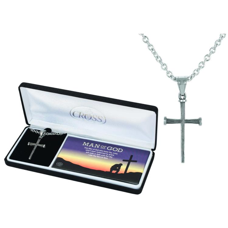 Man of God Men’s Nail Cross Necklace Nail design cross has antique textured look and feel. Stainless steel cross is 11/4″”L x 7/8″”W on 3/8″” bale. Stainless steel cable chain is 24″”. Deluxe black gift box has man and cross silhouette design the words Man of God and a short poem. Ideal gift Father’s Day graduation or any time.
