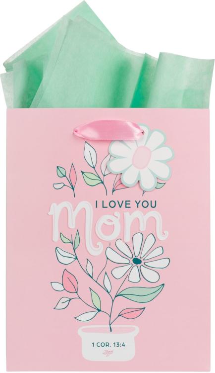 Wrap your special gift in the I Love You Mom Pink and White Daisy Medium Gift Bag and let her know that you appreciate her love, care, and prayers.