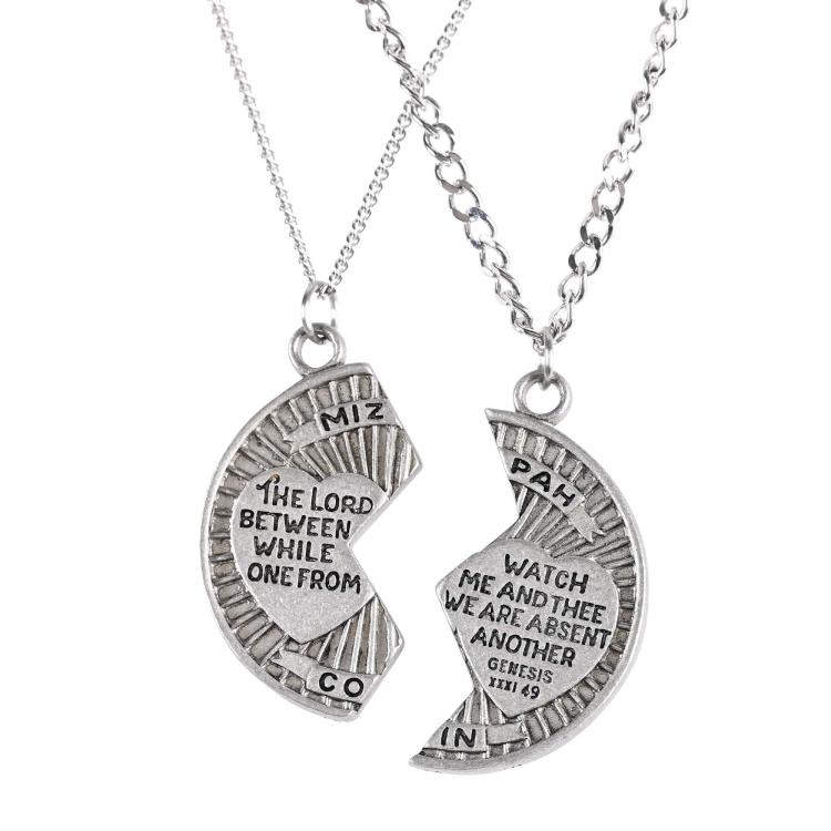 Mizpah Coin necklace set is pewter with satin finish. Each pendant is 1 3/16″” length, on stainless steel chains, one 18″” and one 24″”. Necklace set comes in a deluxe black gift box.