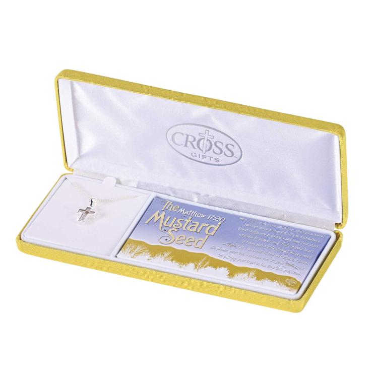 This cross necklace has a real mustard seed inside. It’s a fitting reminder of Jesus’ words in Matthew 17:20 that faith as small as that seed can move huge mountains. Silver rimmed cross pendant is 5/8″”; silver chain is 18″”. Gift boxed with our poem “”The Mustard Seed.”” Text of poem: With faith there is so much that you can achieve, you can move mountains, if you first believe. Great things are possible when they first start with lots of prayer and faith in your heart. It takes just a little, in fact all you need is faith that’s as small as a mustard seed. So please wear this necklace, and let your faith grow, by putting your trust in the God that you know. Poem copyright Dicksons, Inc.