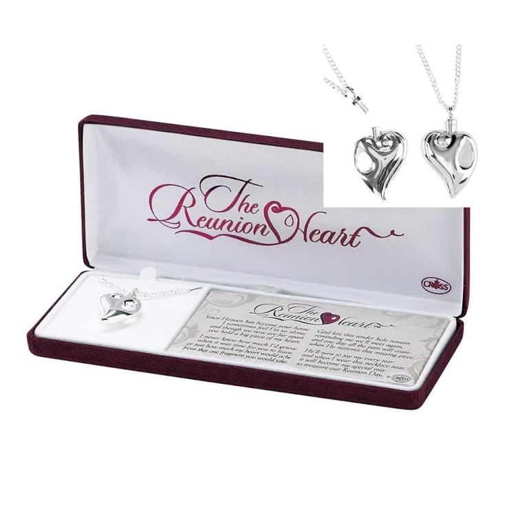 Keep memories of your loved one close to your heart when you wear the Reunion Heart Urn Necklace. Silver plated heart pendant, with its cutout teardrop, is about 1 1/4″” high. The silver plated chain is 24″”. Included are filling instructions you can give to your funeral home or crematory. The necklace comes in a deluxe presentation gift box with the poem, The Reunion Heart. Reunion Heart design is copyright Dianne Waggoner; poem is copyright Dicksons, Inc.