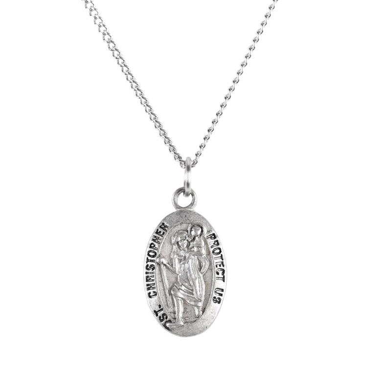 An image of St. Christopher, patron saint of travelers, and the words “”Saint Christopher Protect Us”” are featured on this 11/16″” lead-free pewter medallion. Stainless steel 18″”chain. Gift boxed.