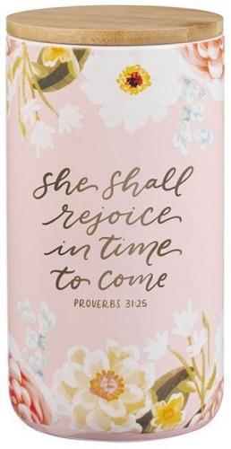 The She Shall Rejoice Ceramic Gratitude Jar is part of the Margo Collection, featuring Alison Loveall’s artwork. This collection includes a scented candle in a glass jar, a die-cut magnet, a faux leather luggage tag, a faux leather checkbook wallet, a faux leather journal, a faux leather bookmark, a spiral journal, a stainless steel tumbler, a ceramic spoon rest a ceramic gratitude jar and a note-taking Bible and a gift bag.