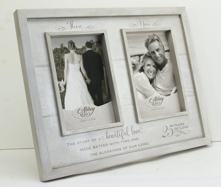 This rustic looking frame is crafted of MDF and designed to hold two 4″ x 6″ photos.