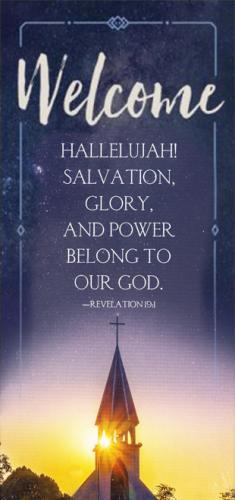 The peaceful sunset image features Revelation 19:1 (CSB): Hallelujah! Salvation, Glory, and Power Belong To Our God.